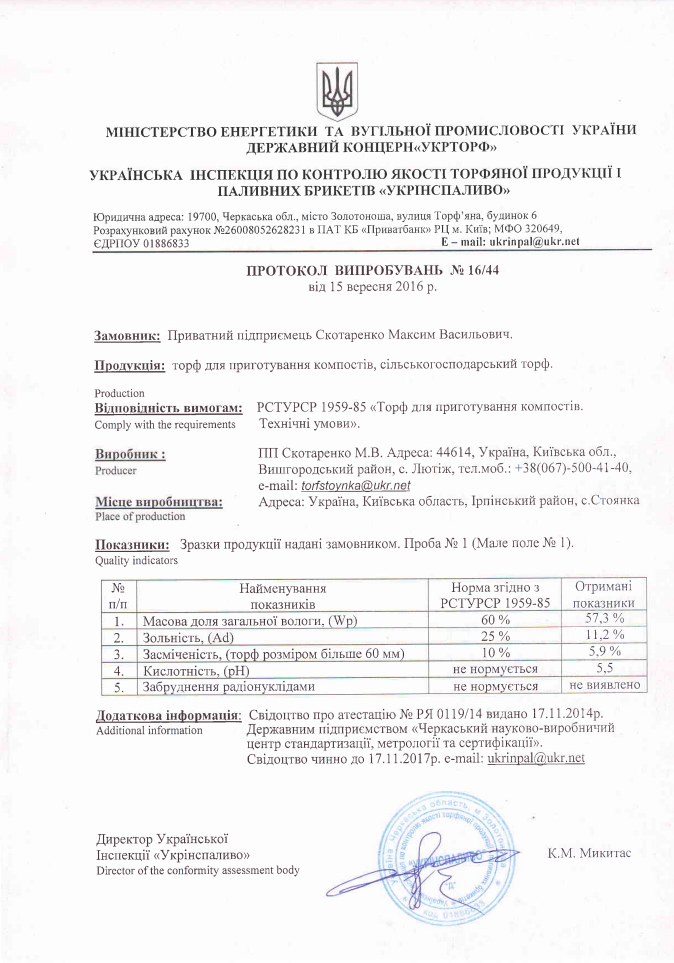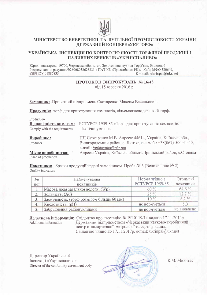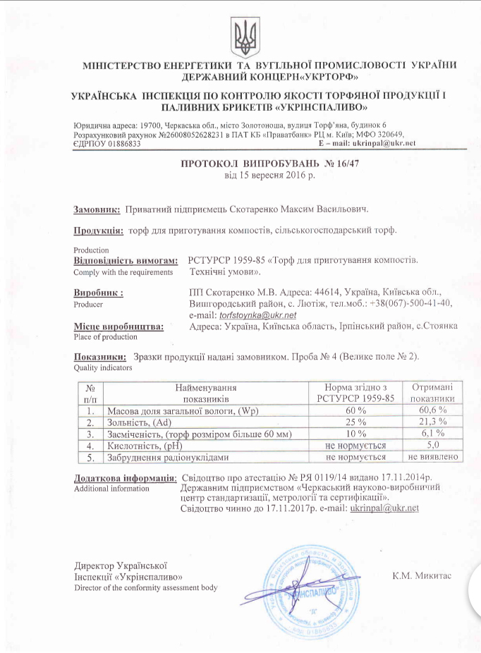 Пропонований нашою компанією торфмає сертифікат відповідності, протоколи дослідження хімічного аналізу, які гарантують його якість, екологічну чистоту та безпеку для використання.